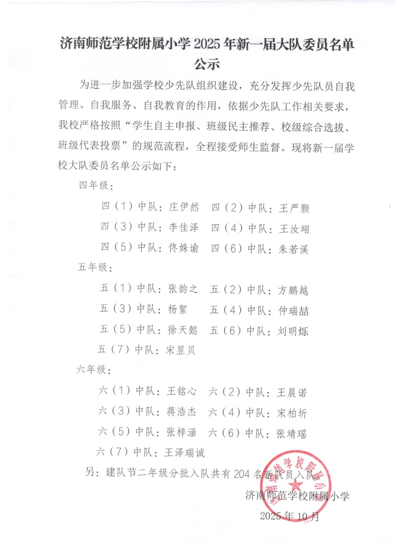 为进一步加强学校少先队组织建设,充分发挥少先队员自我管理、自我服务、自我教育的作用,依据少先队工作相关要求,我校严格按照“学生自主申报、班级民主推荐、校级综合选拔、班级代表投票”的规范流程,全程接受师生监督。现将新一届学校大队委员名单公示如下: