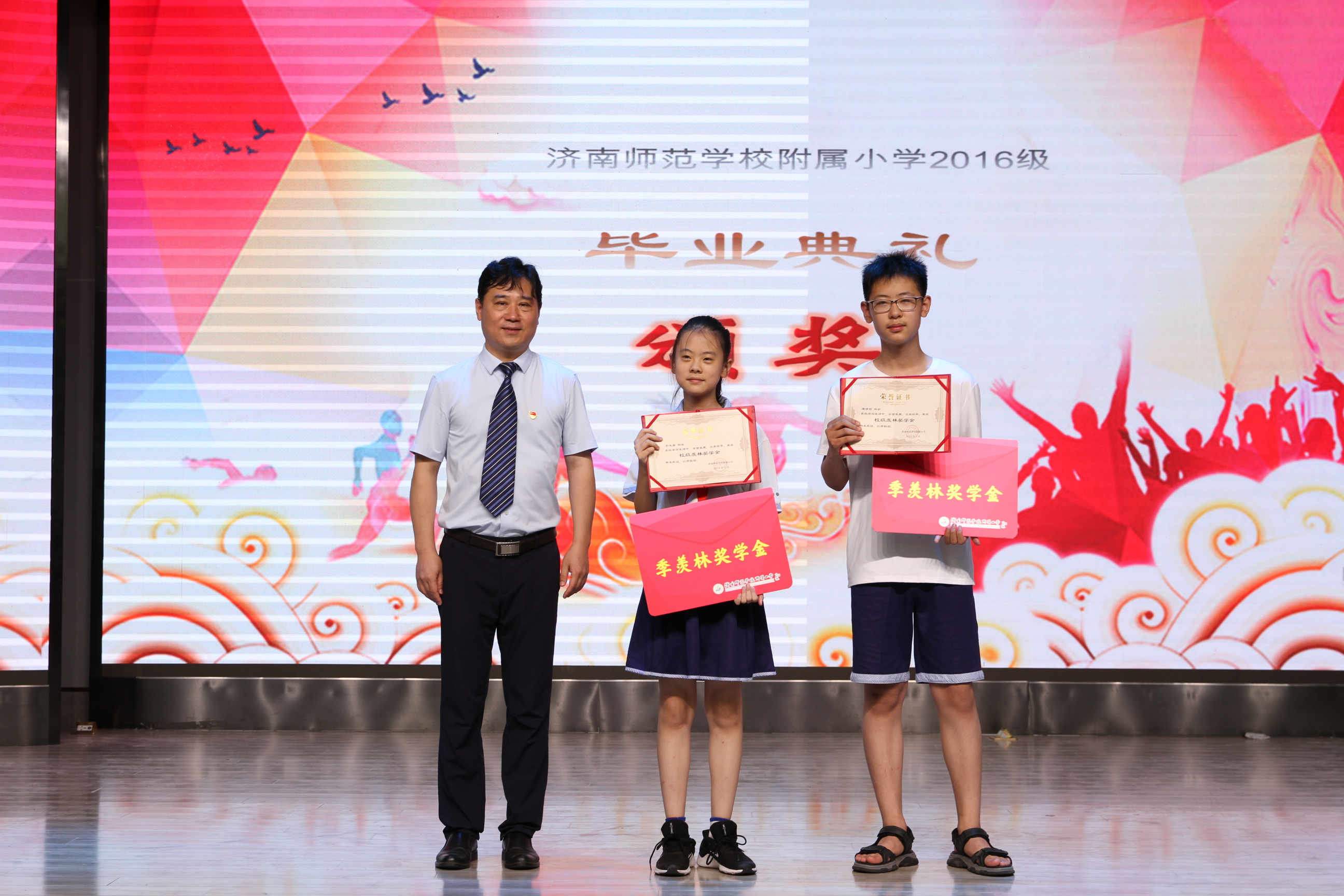 副校长边敦明宣读“羡林奖”提名奖获得者名单。校长朱峰揭晓羡林奖的获得者并为其颁奖。副校长刘一明宣读济南市优秀学生、济南市优秀学生干部名单并为其颁发证书。学校为六年级毕业生颁发毕业证书和纪念册。