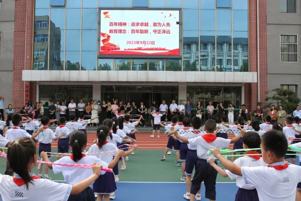 在学校操场上,与会专家来宾共同欣赏了二年级球操、三年级绳操等阳光体育大课间展示和五六年级“少年军校”的国防教育综合训练。济师附小作为省级艺术教育示范校和体育传统项目学校,多年来一直深耕学生素质教育,五育融合,五育并举,致力于培养具有“强健的体魄,自由的精神,良好的习惯,广泛的兴趣”的卓越附小学生。附小学生朝气蓬勃、自信大方的良好风貌赢得了与会专家来宾的一致称赞。